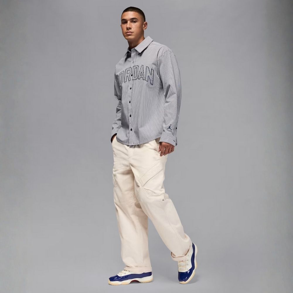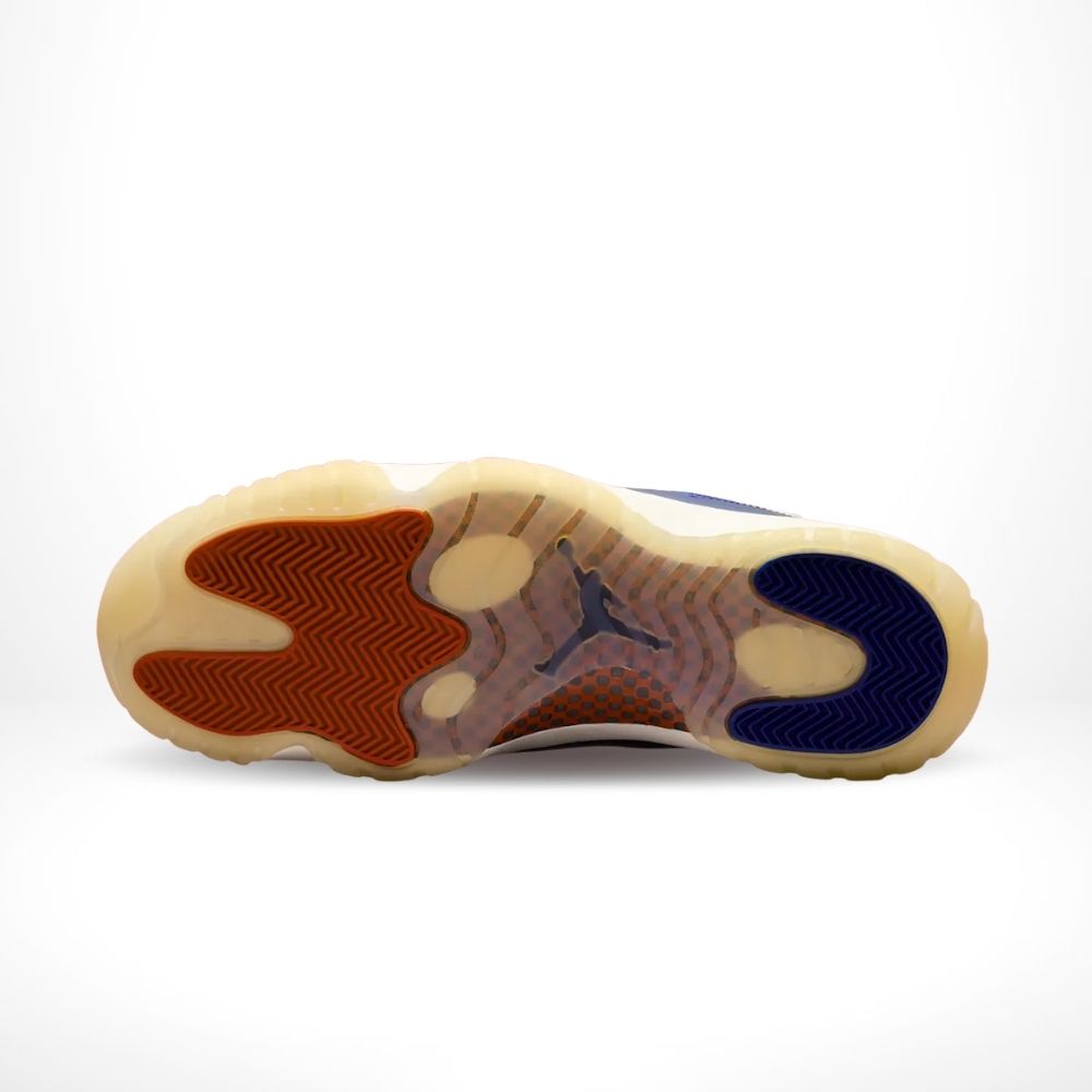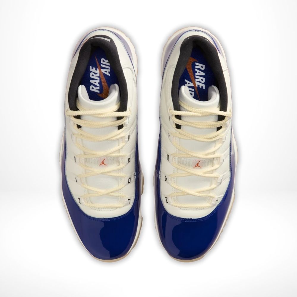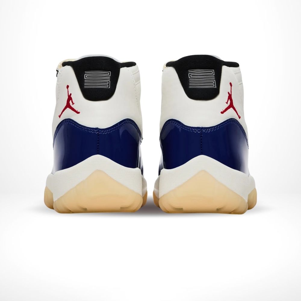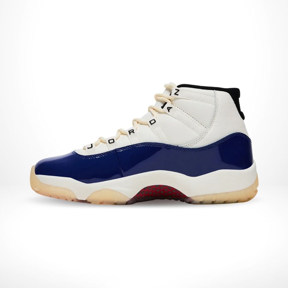 The Air Jordan 11 Retro “Rare Air” stands out with a clean mix of white leather and deep navy patent overlays, finished with bold red Jumpman accents. The “JORDAN” lettering along the lace loops adds a modern twist to the iconic silhouette. Set atop a translucent gum outsole, this pair blends heritage style with premium craftsmanship for a refined, standout look.