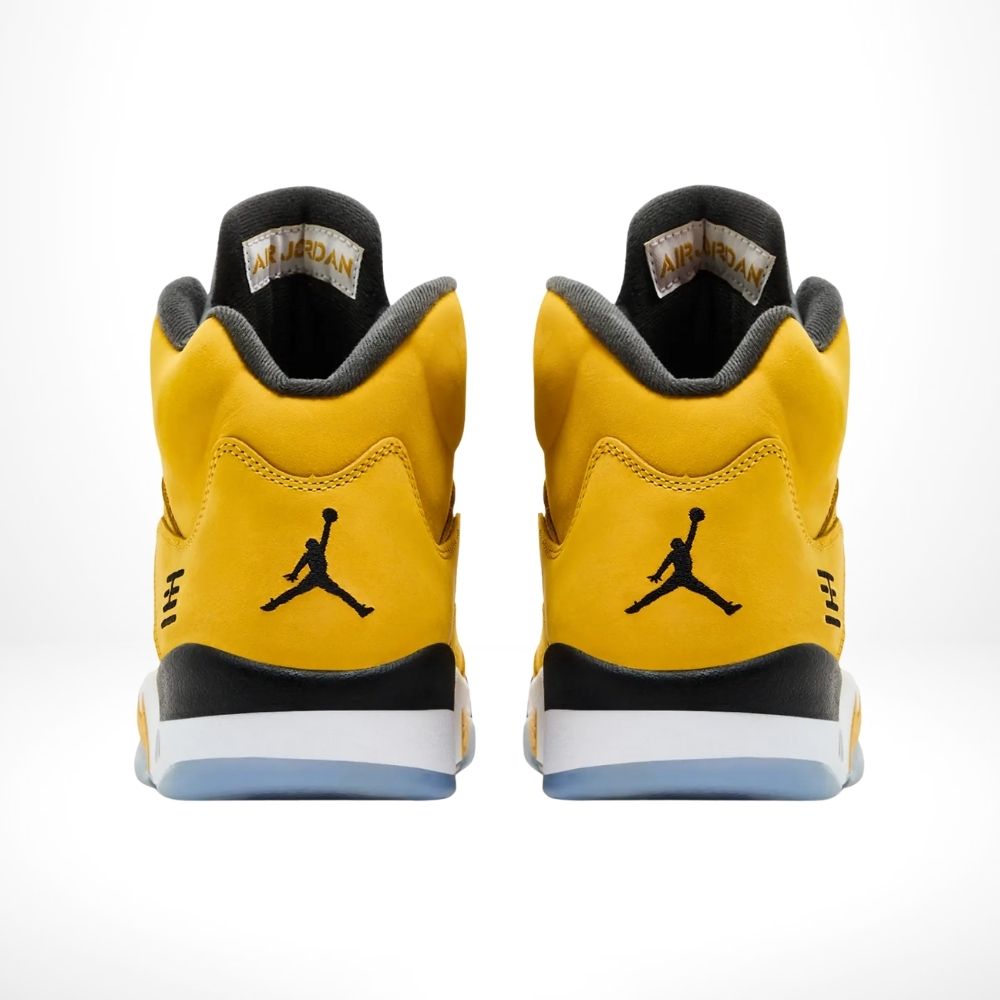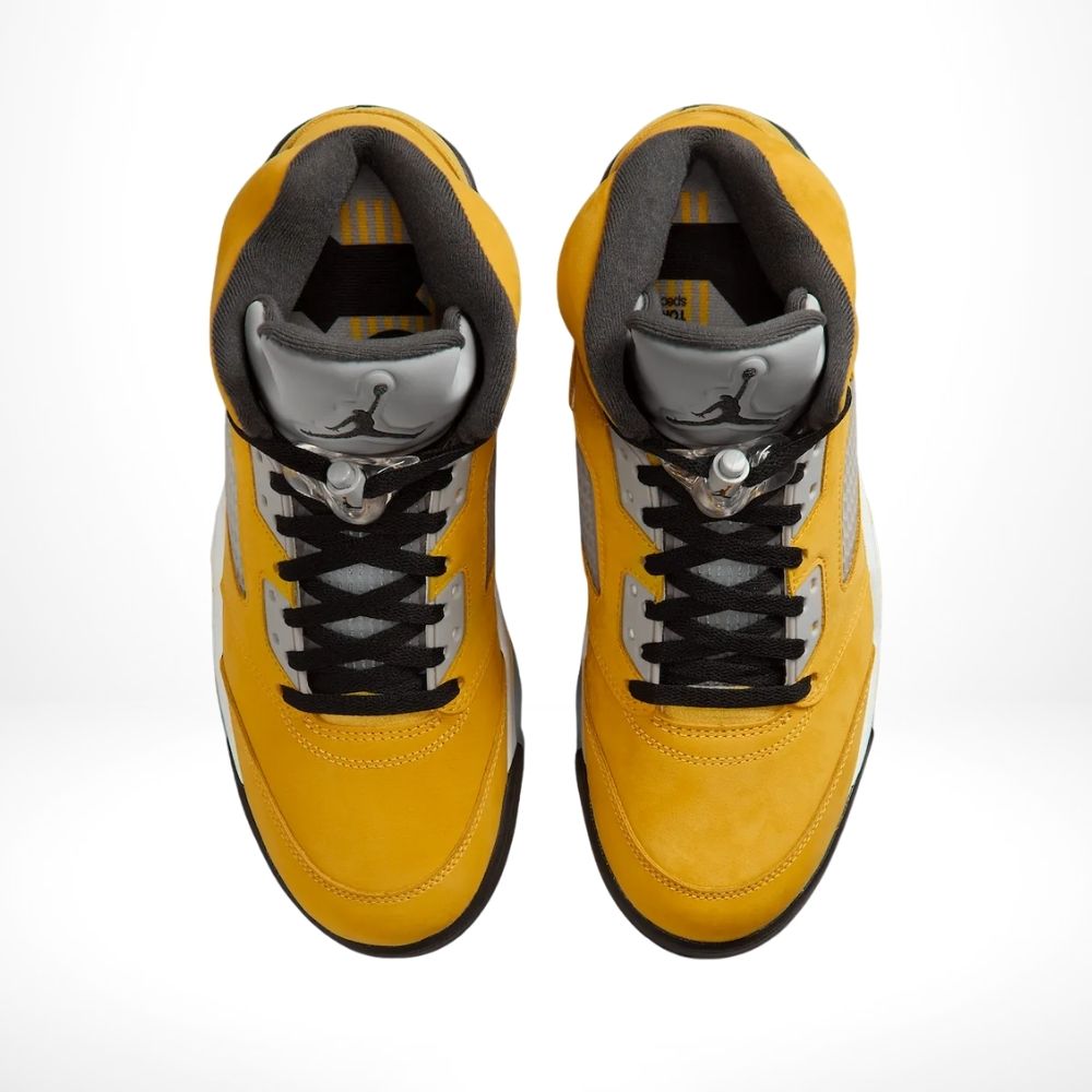 The Air Jordan 5 Retro Tokyo T23 (2025) revives the legendary 2011 release with a bold Varsity Maize nubuck upper, reflective tongue, and black detailing. A stylized “23” logo and Japanese-inspired emblem on the heel pay tribute to Tokyo heritage, while shark-tooth midsoles and translucent outsoles complete this timeless design.
