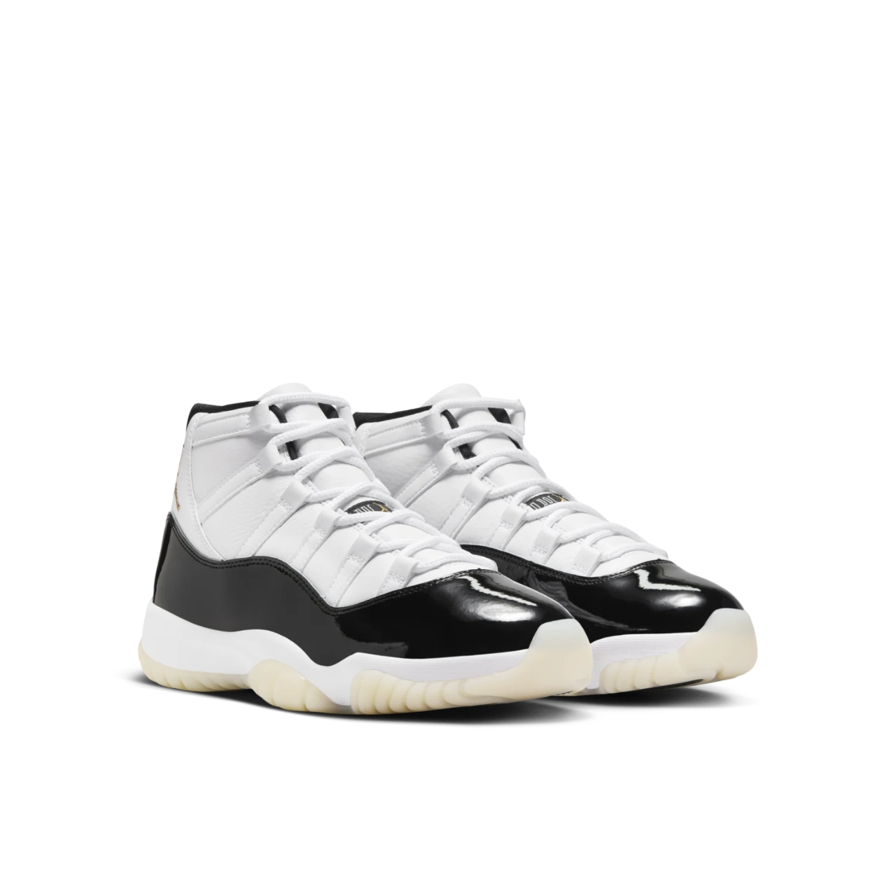 The Air Jordan 11 Retro DMP “Gratitude” 2023 celebrates Jordan Brand’s legacy with a refined black-and-white color scheme, inspired by the original “Defining Moments Pack.” It features a white mesh upper, glossy black patent leather mudguard, and elegant metallic gold accents on the branding. With its iconic silhouette, carbon fiber shank plate, and translucent outsole, this release honors MJ’s greatness with both style and substance.