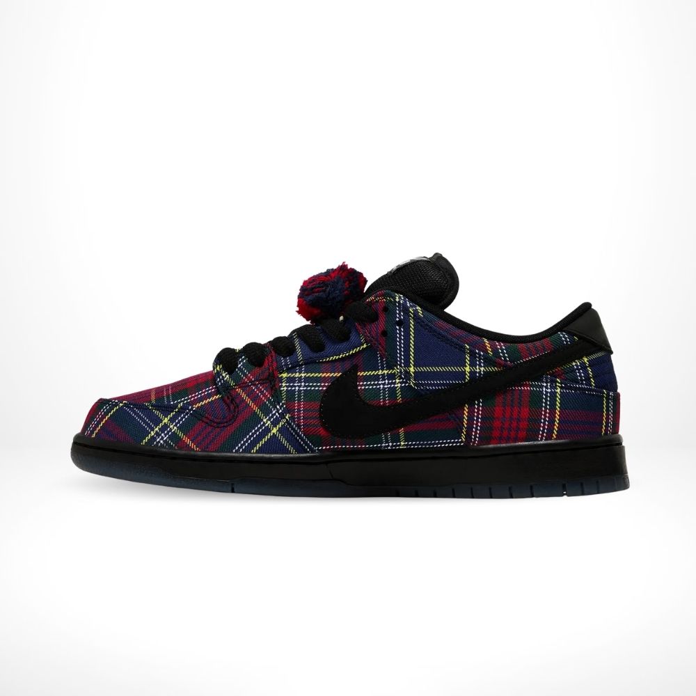 The Nike SB Dunk Low x Nardwuar “Tam O’ Shanter” features a red tartan plaid upper inspired by Nardwuar’s signature hat. Suede overlays and custom details honor the iconic interviewer’s eccentric style, blending skate heritage with bold personality.